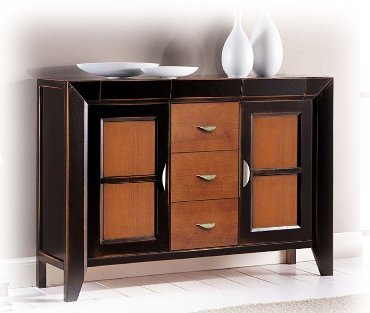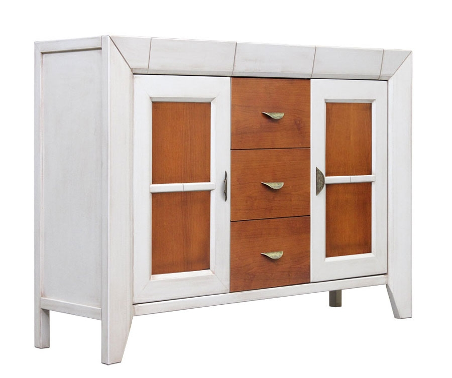 Schöne zweifarbige Anrichte mit Türen und Schubladen, sehr originell wegen Form und Farbe.