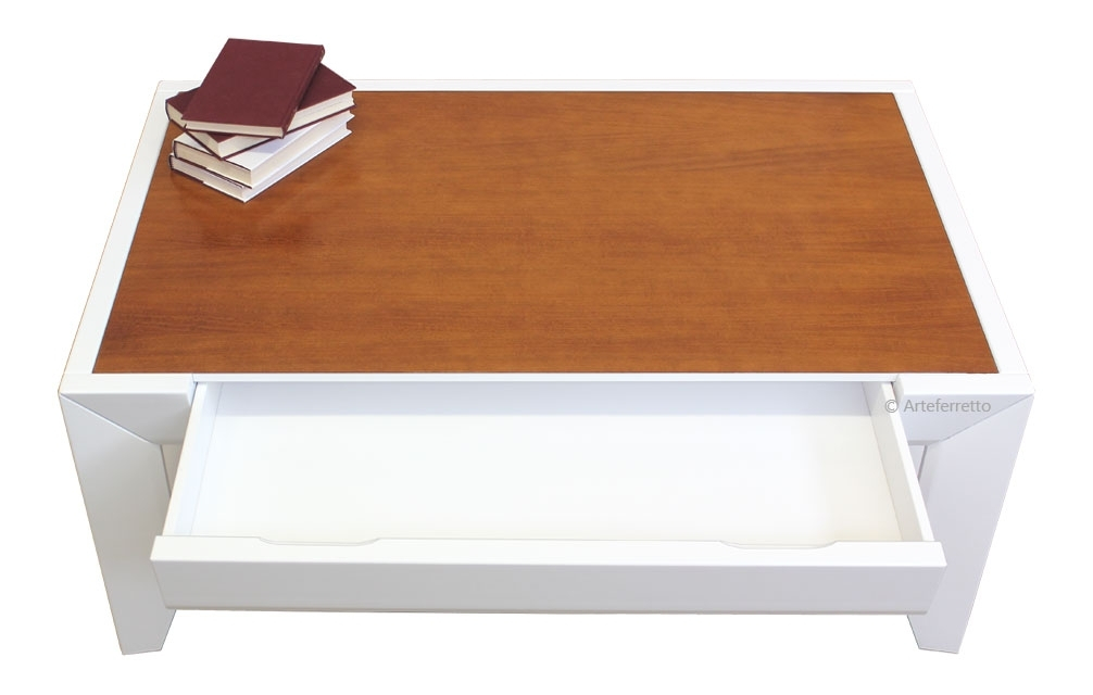 Die Tischplatte ist geräumig, er hat aber auch einen Einlegeboden und eine Schublade im Kranz. Der Couchtisch bietet also viel Raum.