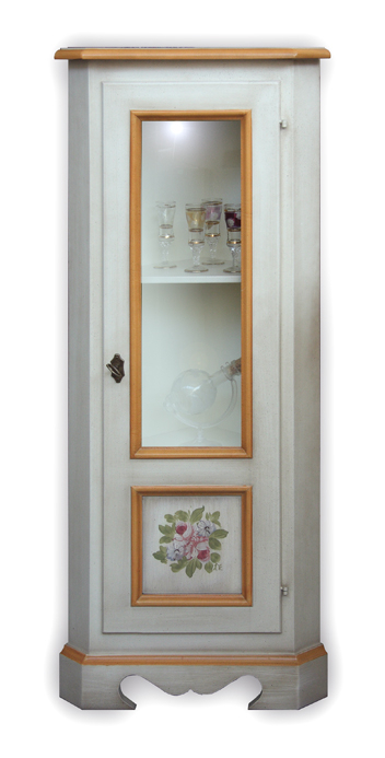 Eckschrank mit Glastür und dekorierter Tür ideal für eine Landhausstile Einrichtung.