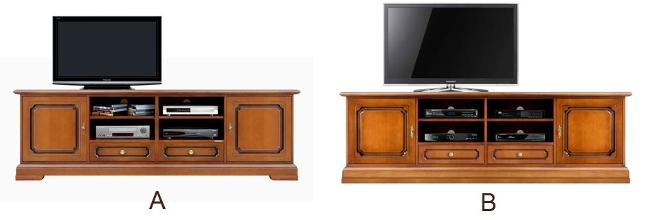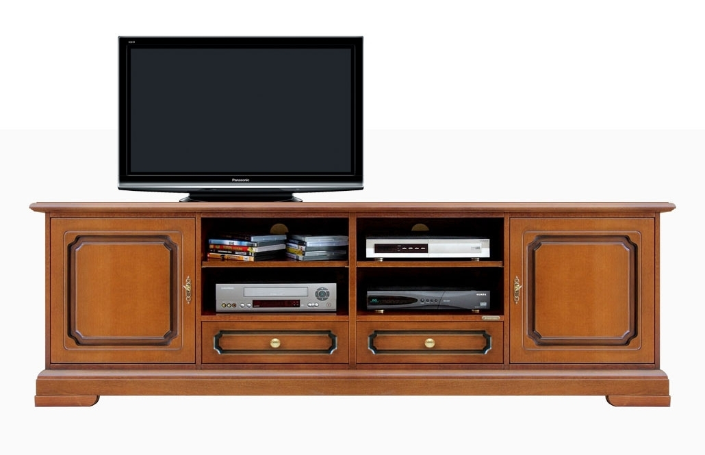 TV-Schrank Massivholz mit 2 geräumige Schubkästen und 2 funktionelle Fächern. Die Besonderheiten dieses Möbel sind die Zweckmäßigkeit und die elegante Linie.