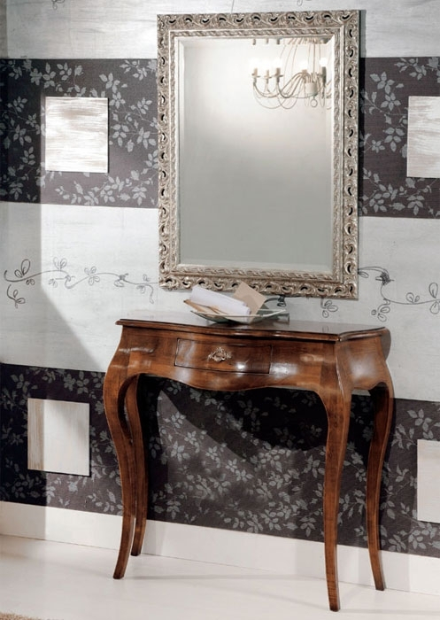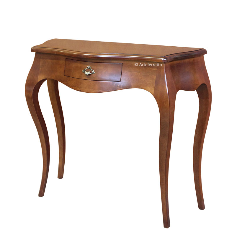 Schwarzer Konsolentisch 2 Schubladen, sehr schön mit einer profilierten Linie.Die Struktur ist schlicht und elegant, perfekt für jede Wohneinrichtung, z.B. mit einem Spiegel, einem Bild, usw.Das Möbel hat 2 Schubladen. Der Farbton ist auf dem Bild Schwarz antik: die Basis ist aus Kirschholz, dann wird die Schwarzlackierung gemacht und danach ist die Schleifung des Farbtons der Möbelkanten. Das Möbel ist also Schwarz und auch Kirschholz in den Kanten und im Inneren.Schwarzer Konsolentisch 2 Schubladen ideal für Wohnzimmer, Flur, Wartehalle, usw.Bei der Lieferung ist es schon montiert.Maße:Breite 96 cm;Höhe 80,5 cm;Tiefe 41 cm.
