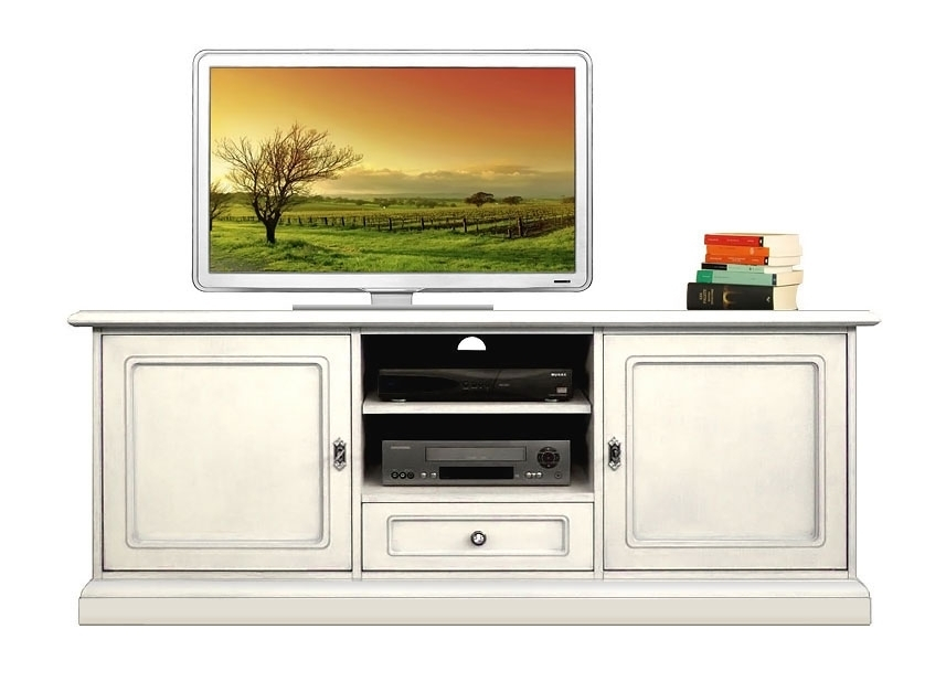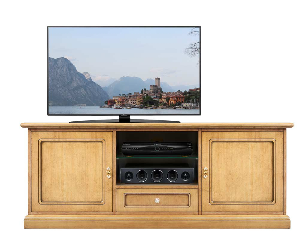 Zwischen der Schranktüren hat es 2 Fächer für die Fernseher-Ausrüstung, z.B. CD Leser, Decoder, Home Theater, etc.