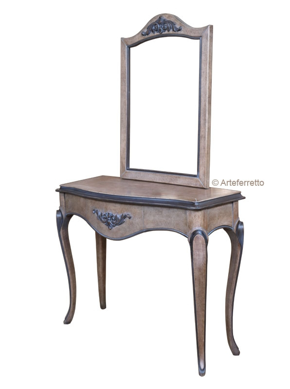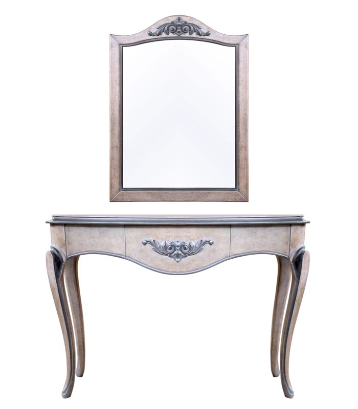 Der Konsolentisch hat eine Schublade im Zentrum, wo eine schöne Schnitzarbeit gemacht ist. Diese elegante Bearbeitung steht auch im Oberteil des Spiegels, um beide Möbelstück zueinander gut passen.