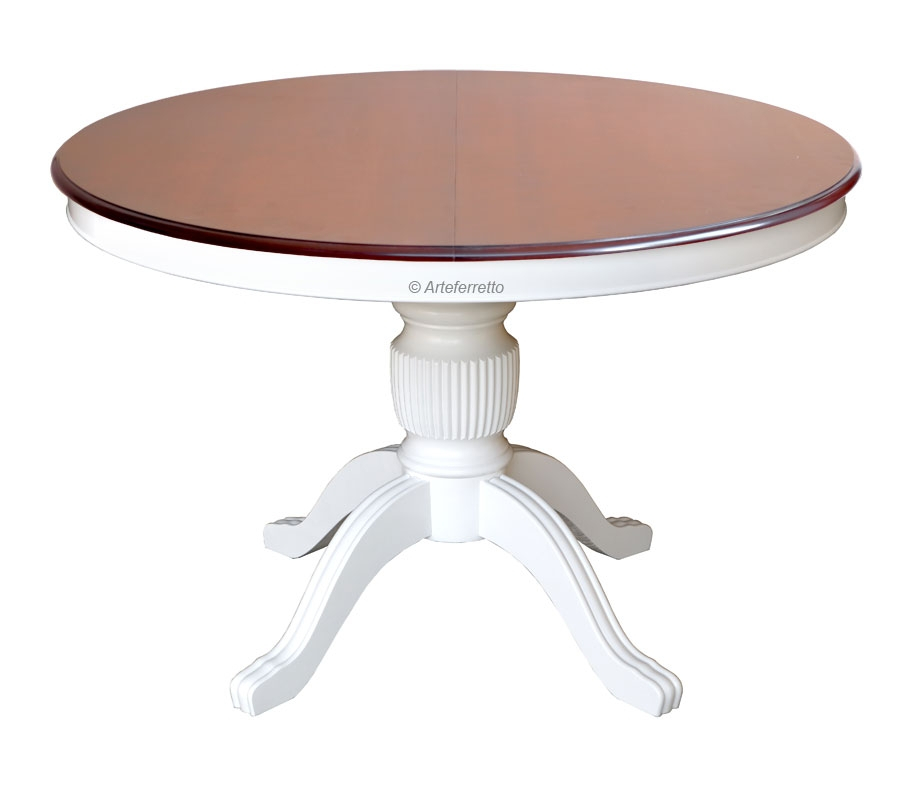 Die Merkmale sind die zwei Farben (Tischplatte in klassischen Farben und Struktur in lackierten Farben) und die zentrale Beine mit elegante Schnitzarbeiten.