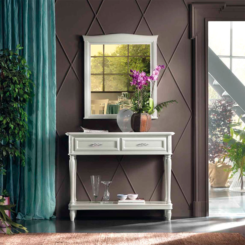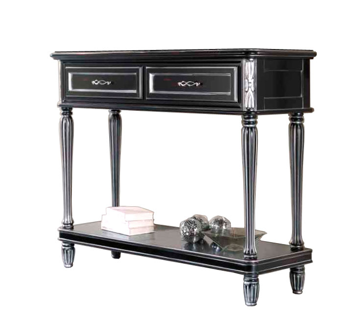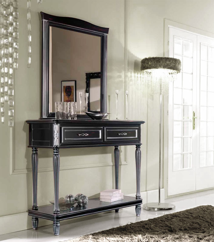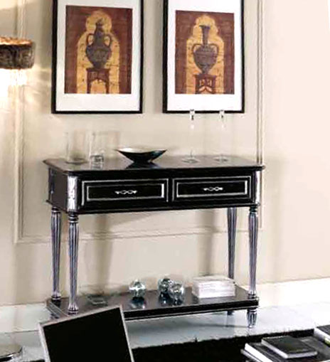 Schwarzer Konsolentisch 2 Schubladen, sehr schön mit einer profilierten Linie.Die Struktur ist schlicht und elegant, perfekt für jede Wohneinrichtung, z.B. mit einem Spiegel, einem Bild, usw.Das Möbel hat 2 Schubladen. Der Farbton ist auf dem Bild Schwarz antik: die Basis ist aus Kirschholz, dann wird die Schwarzlackierung gemacht und danach ist die Schleifung des Farbtons der Möbelkanten. Das Möbel ist also Schwarz und auch Kirschholz in den Kanten und im Inneren.Schwarzer Konsolentisch 2 Schubladen ideal für Wohnzimmer, Flur, Wartehalle, usw.Bei der Lieferung ist es schon montiert.Maße:Breite 96 cm;Höhe 80,5 cm;Tiefe 41 cm.