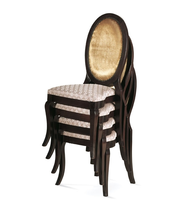 Stapelstuhl holz gepolstert mit ovaler Rücklehne.