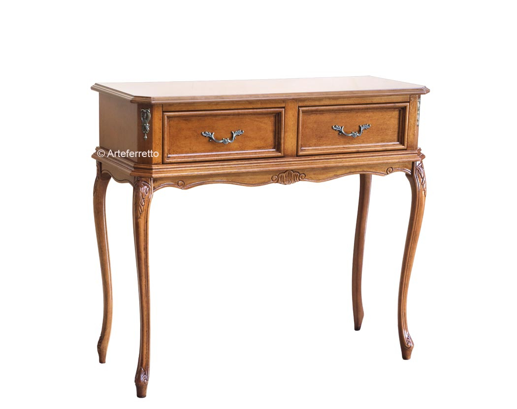 Schwarzer Konsolentisch 2 Schubladen, sehr schön mit einer profilierten Linie.Die Struktur ist schlicht und elegant, perfekt für jede Wohneinrichtung, z.B. mit einem Spiegel, einem Bild, usw.Das Möbel hat 2 Schubladen. Der Farbton ist auf dem Bild Schwarz antik: die Basis ist aus Kirschholz, dann wird die Schwarzlackierung gemacht und danach ist die Schleifung des Farbtons der Möbelkanten. Das Möbel ist also Schwarz und auch Kirschholz in den Kanten und im Inneren.Schwarzer Konsolentisch 2 Schubladen ideal für Wohnzimmer, Flur, Wartehalle, usw.Bei der Lieferung ist es schon montiert.Maße:Breite 96 cm;Höhe 80,5 cm;Tiefe 41 cm.