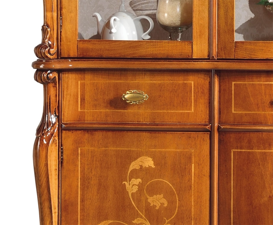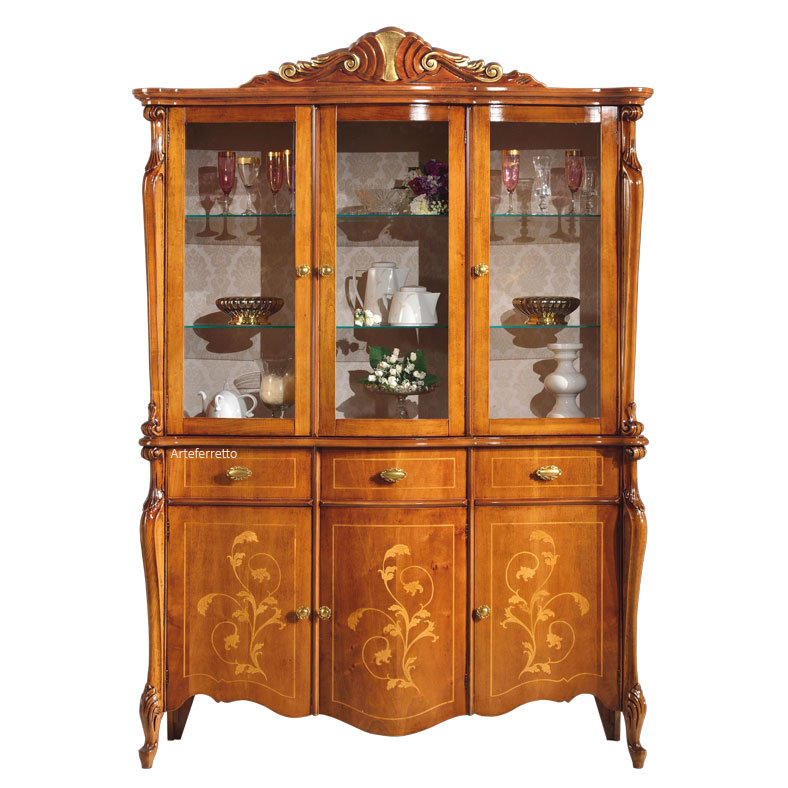 Glasschrank mit Aufsatz und Intarsien im klassischen Stil.