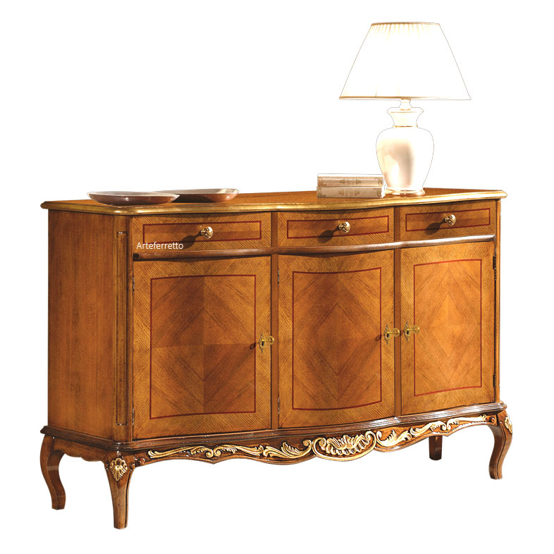 Die gewölbte Fassade, die geschnitzte Beine und Unterteil sind die Merkmale dieser Anrichte 3 Türen mit Details in Goldblatt, das von spezialisierten Handwerkern abgestellt wird.