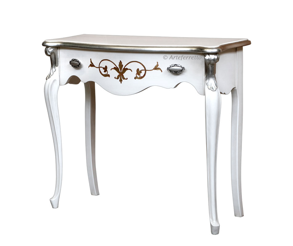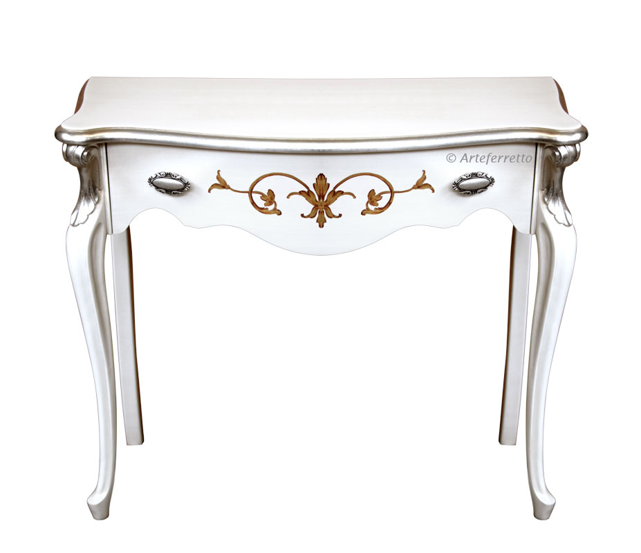 Schwarzer Konsolentisch 2 Schubladen, sehr schön mit einer profilierten Linie.Die Struktur ist schlicht und elegant, perfekt für jede Wohneinrichtung, z.B. mit einem Spiegel, einem Bild, usw.Das Möbel hat 2 Schubladen. Der Farbton ist auf dem Bild Schwarz antik: die Basis ist aus Kirschholz, dann wird die Schwarzlackierung gemacht und danach ist die Schleifung des Farbtons der Möbelkanten. Das Möbel ist also Schwarz und auch Kirschholz in den Kanten und im Inneren.Schwarzer Konsolentisch 2 Schubladen ideal für Wohnzimmer, Flur, Wartehalle, usw.Bei der Lieferung ist es schon montiert.Maße:Breite 96 cm;Höhe 80,5 cm;Tiefe 41 cm.
