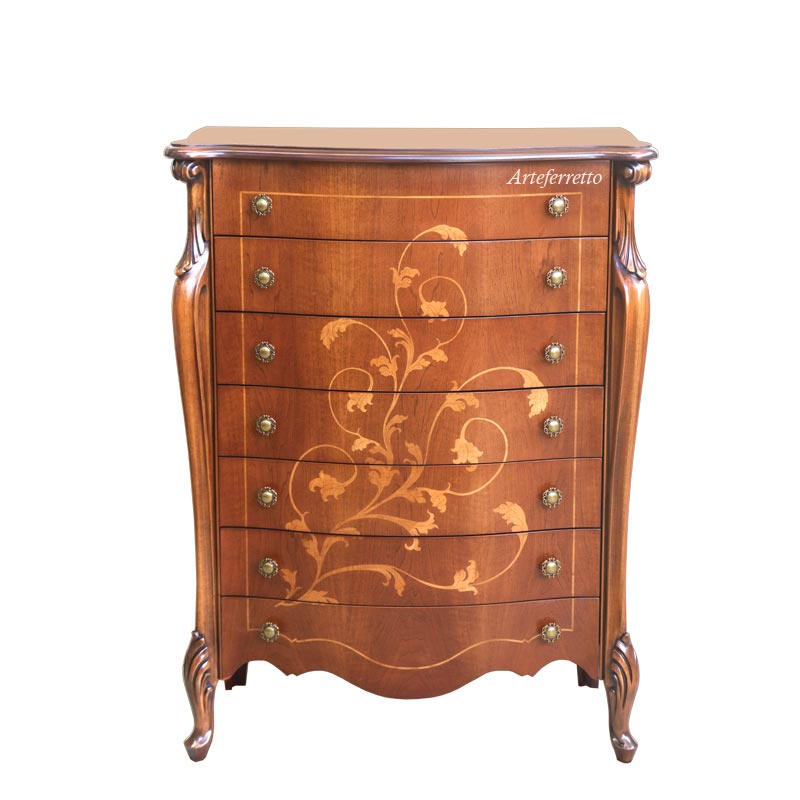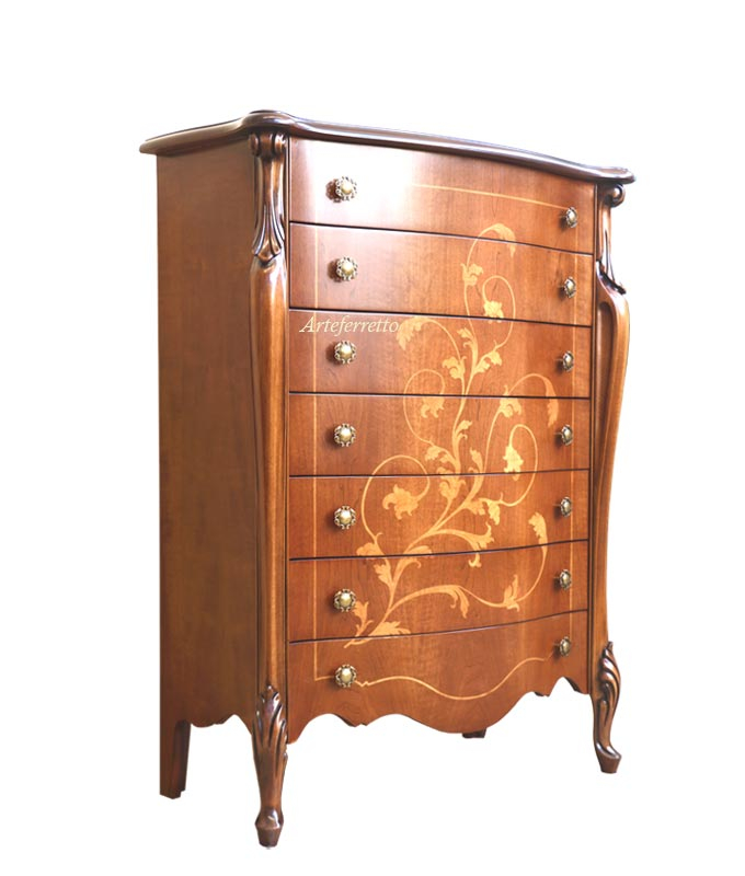 Kommode 7 Schubkästen im klassischen Stil.Schöne Kommode ideal für jede Wohnungsräume, sehr elegant und praktisch. Diese Kommode ist ideal z.B. für Schlafzimmer oder Flur. Dieses Möbel hat 7 Schubkästen, die sehr geräumig sind.Die Besonderheiten dieser Kommode sind also die elegante Linie, die Zweckmäßigkeit zusammen.Das Möbel ist eng aber die Struktur ist stark.Bei der Lieferung ist das Möbel montiert.Maße:Breite 53 cm;Tiefe 34 cm;Höhe 119 cm.Innen-Schubkästen:Breite 38,9 cm;Tiefe 26,3 cm;Höhe 11,3 cm.
