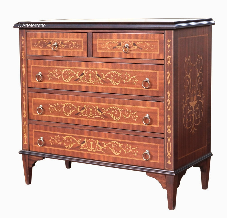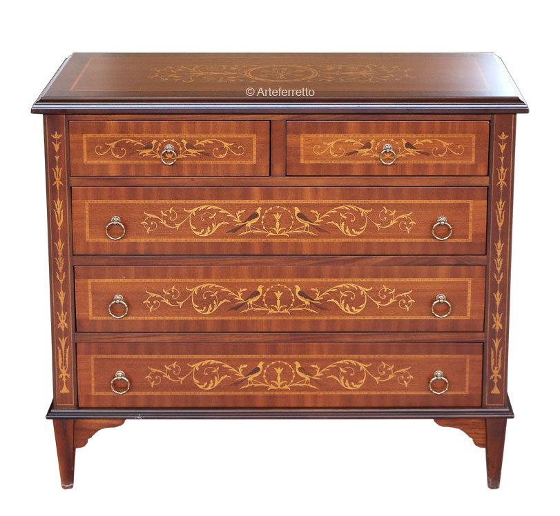 Kommode aus Holz mit 5 Schubladen, deren Fassade von klassischen Intarsie verschönert sind.
