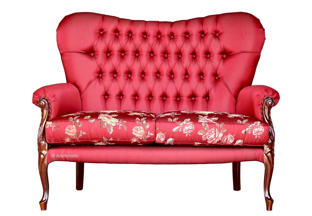 Zweisitzer Sofa klassisch sehr bequem und elegant. Möbel im Stil haltbar und fein, weil die Struktur sehr stark und aus Buchenholz ist und von spezialisierten Handwerkern mit den traditionale Schwalbenschwanzverbindung zusammengebaut. Die starke Struktur ist von hochwertigen Bezug gepolstert und in der Rücklehne gibt es die Knöpfen, die einen Merkmale "Klassik" dem Sofa geben. Zweisitzer Sofa klassisch sehr schön und wertvoll dank der Arbeit von verschiedenen Handwerkern und der Achtsamkeit der Details (Posamenten, Kissen, Knöpfen...). Sitzkissen sind bequem, weich aber nicht verformbar. Das Sofa ist mit zwei Stoffen gepolstert, um Kontraste und Eleganz zu haben. Das ist ein Möbel für Wohnzimmer, das unbemerkt nicht bleib, und Ihre Einrichtung wunderschön sein wird.