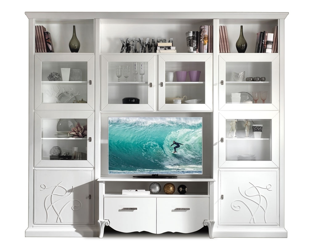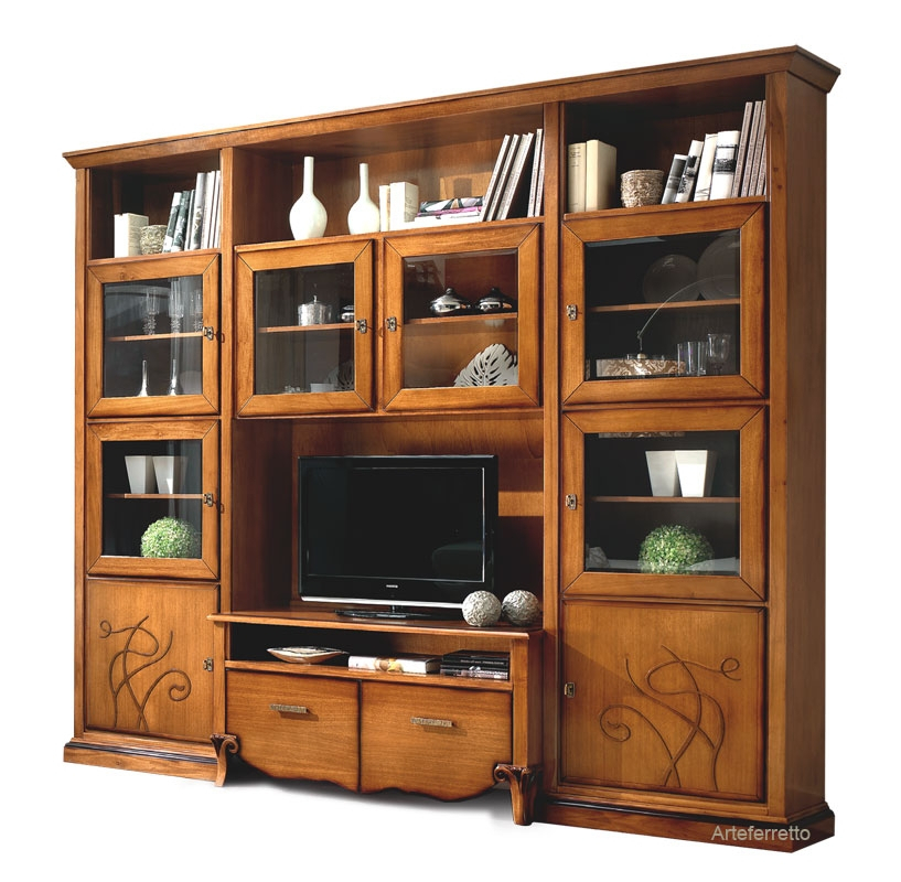 Wohnwand Massivholz für Wohnzimmer sehr fein. In dem Zentralteil gibt es das TV-Möbel, das elegant ist und geschnitzte Füße hat. Ein schöner Vorsprung kennzeichnet die Türen in dem Unterteil. Das zentrales Fach für TV ist breit und von viele Glastüren umgebend (Raum 124 cm und 79 cm Höhe). Wohnwand Massivholz mit Fächer in dem Oberteil, um Ihnen ein funktionales Möbel zu geben. Möbel im Stil für Wohnzimmer im klassischen Stil, das eine ganze Wand einrichten. Einrichtung im Stil, aber auch modern, sehr elegant und von spezialisierten Handwerkern lackiert und gemacht. Wand für Wohnzimmer mit Fach für TV bei der Lieferung nicht montiert aber die Montage ist sehr einfach.