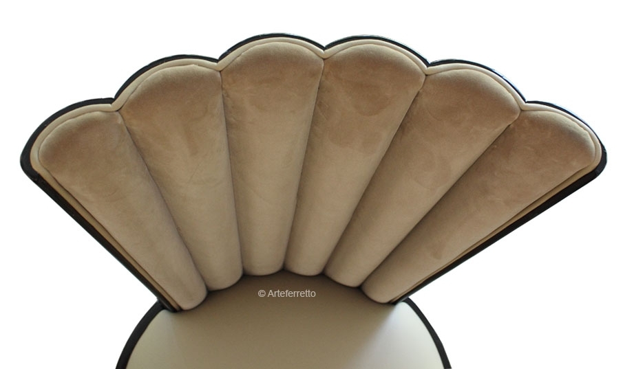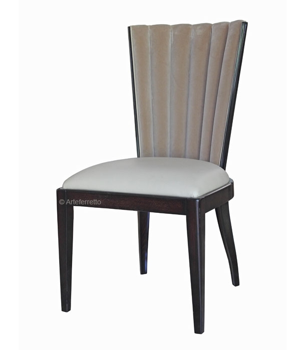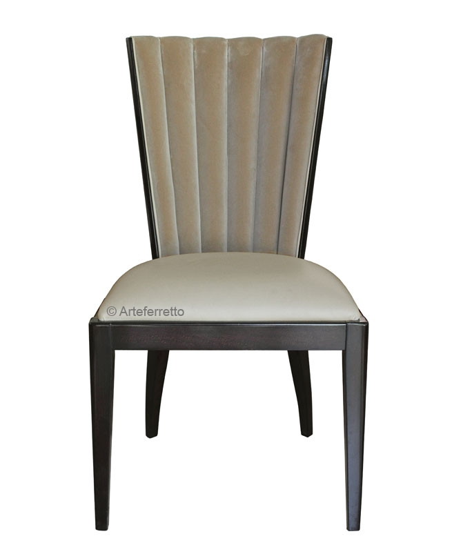 Die Besonderheit des Stuhls ist die spezielle Rücklehne, die in der Rückseite aus Holz ist und in der Vorderseite eine schöne Polsterarbeit hat.
