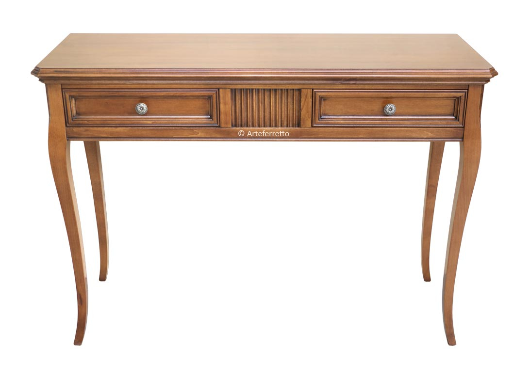 Schwarzer Konsolentisch 2 Schubladen, sehr schön mit einer profilierten Linie.Die Struktur ist schlicht und elegant, perfekt für jede Wohneinrichtung, z.B. mit einem Spiegel, einem Bild, usw.Das Möbel hat 2 Schubladen. Der Farbton ist auf dem Bild Schwarz antik: die Basis ist aus Kirschholz, dann wird die Schwarzlackierung gemacht und danach ist die Schleifung des Farbtons der Möbelkanten. Das Möbel ist also Schwarz und auch Kirschholz in den Kanten und im Inneren.Schwarzer Konsolentisch 2 Schubladen ideal für Wohnzimmer, Flur, Wartehalle, usw.Bei der Lieferung ist es schon montiert.Maße:Breite 96 cm;Höhe 80,5 cm;Tiefe 41 cm.