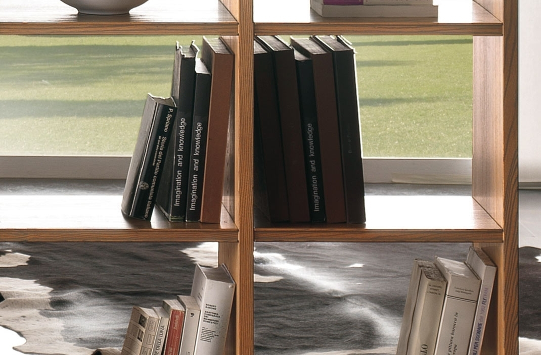 Bücherregal in Stil modern mit vielen breiten Einlegeböden, wo Objekte und Bücher zu legen.