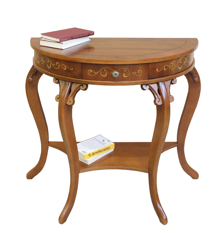 Schwarzer Konsolentisch 2 Schubladen, sehr schön mit einer profilierten Linie.Die Struktur ist schlicht und elegant, perfekt für jede Wohneinrichtung, z.B. mit einem Spiegel, einem Bild, usw.Das Möbel hat 2 Schubladen. Der Farbton ist auf dem Bild Schwarz antik: die Basis ist aus Kirschholz, dann wird die Schwarzlackierung gemacht und danach ist die Schleifung des Farbtons der Möbelkanten. Das Möbel ist also Schwarz und auch Kirschholz in den Kanten und im Inneren.Schwarzer Konsolentisch 2 Schubladen ideal für Wohnzimmer, Flur, Wartehalle, usw.Bei der Lieferung ist es schon montiert.Maße:Breite 96 cm;Höhe 80,5 cm;Tiefe 41 cm.