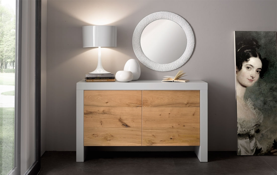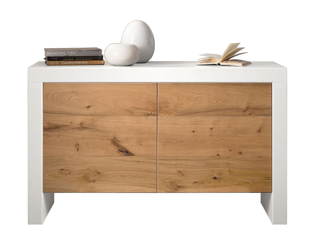 Buffetschrank aus Holz mit 2 Türen und einer einfachen Linie. Die Struktur aus Holz ist lackiert, die Türen sind aus Holz auch. Sie haben aber einen Natureffekt und sind "öffenporig".