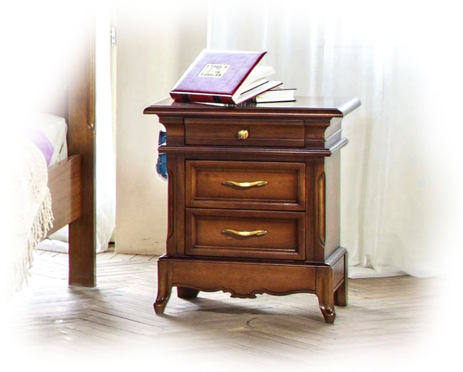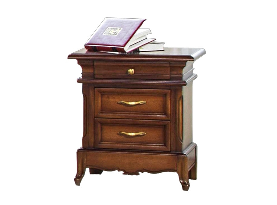 Klassischer Nachttisch mit 3 Schubladen für Schlafzimmer, der gut zur passenden Kommode passt. Der Nachttisch hat 2 geräumige Schubladen und eine kleine Schublade im Oberteil, die ebenso praktisch ist. Er hat eine schlichte und traditionelle Linie und ist perfekt für ein klassisches Schlafzimmer. Der Nachttisch hat aber auch elegante Details wie Schnitzarbeit im Unterteil, die Eleganz und Wert gibt. Das Möbel ist ganz handgemacht. Klassischer Nachttisch bei der Lieferung schon montiert.