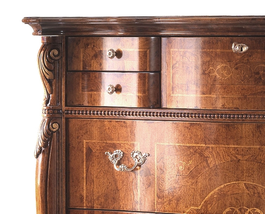 Im Oberteil hat die Kommode eine Klappe mit 4 kleinen Schubladen. Diese Kommode ist die Hauptfigur des Schlafzimmers, besser natürlich mit dem passenden Nachttisch.