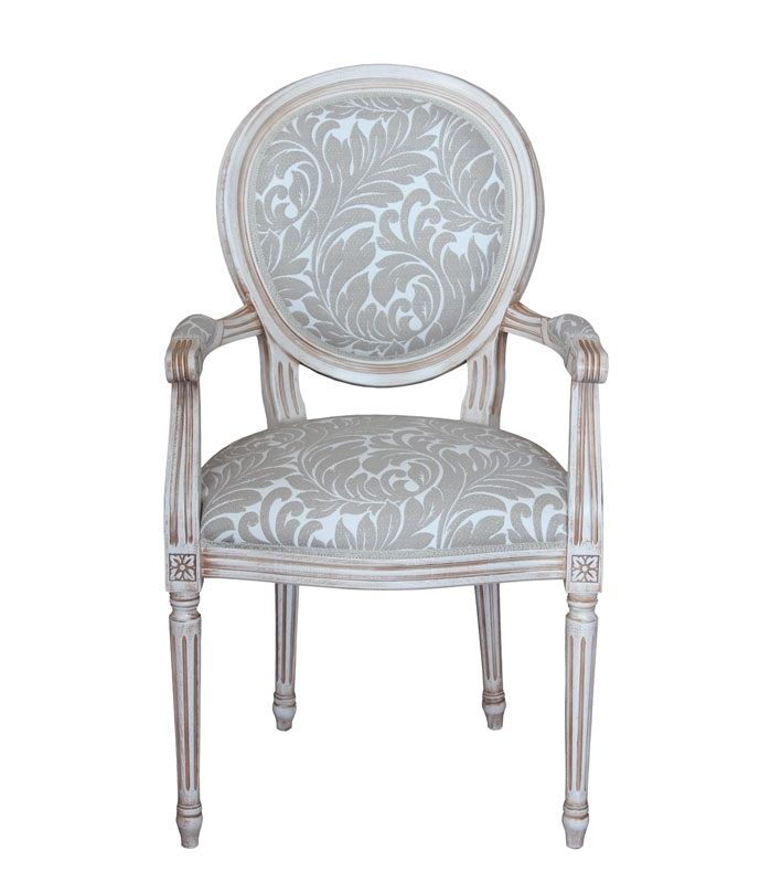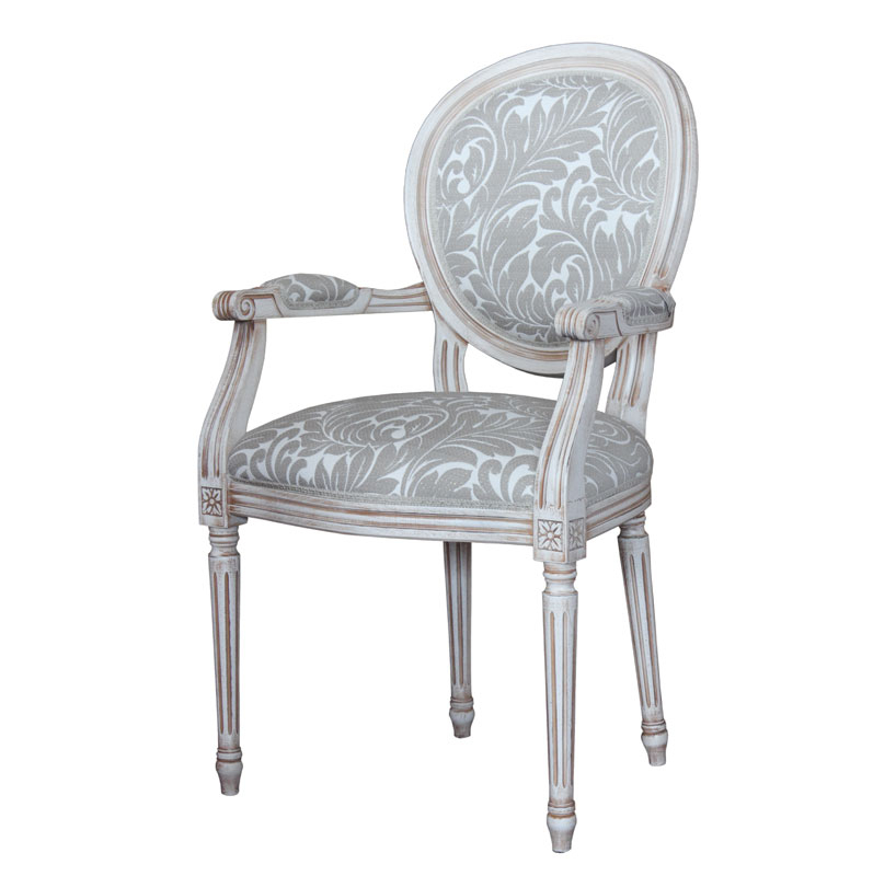 Die Besonderheit des Stuhls ist die starke Patinieriung, die einen alten und antiken Effekt macht. Die Farbe passt gut zum schönen Stoff. Die Polsterung dieses Stuhls mit Armlehnen ist sehr bequem und haltbar.