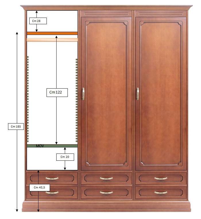 6 unabhängige Schubladen, mit äußerer Öffnung (damit es nicht nötig ist, immer die Türe zu öffnen, um etwas zu nehmen). Der Raum hinter der Türen bietet einen festen Einlegeböden, die Kleiderstange und Einlegeböden, die in der Höhe regelbar sind. Das ist echte Funktionalität.