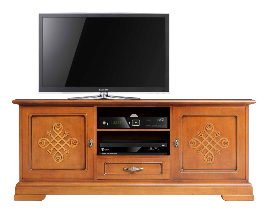 Zwischen der Schranktüren hat es 2 Fächer für die Fernseher-Ausrüstung, z.B. CD Leser, Decoder, Home Theater, etc.