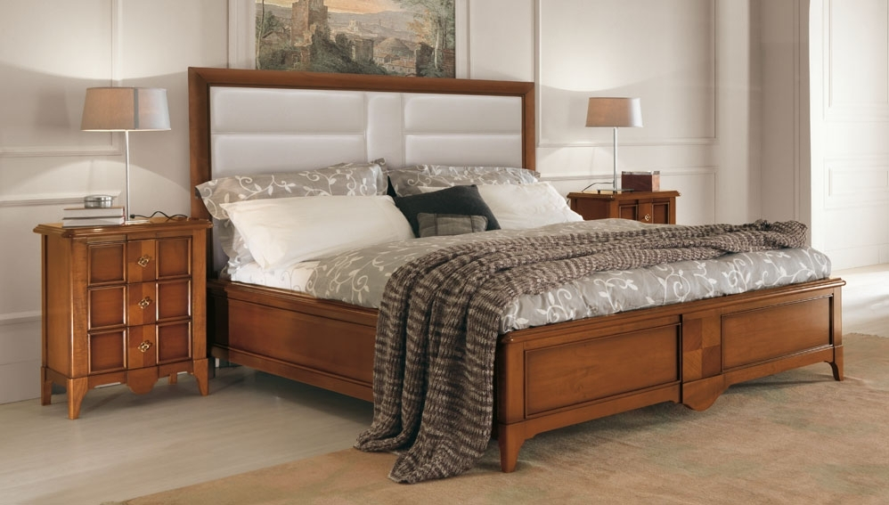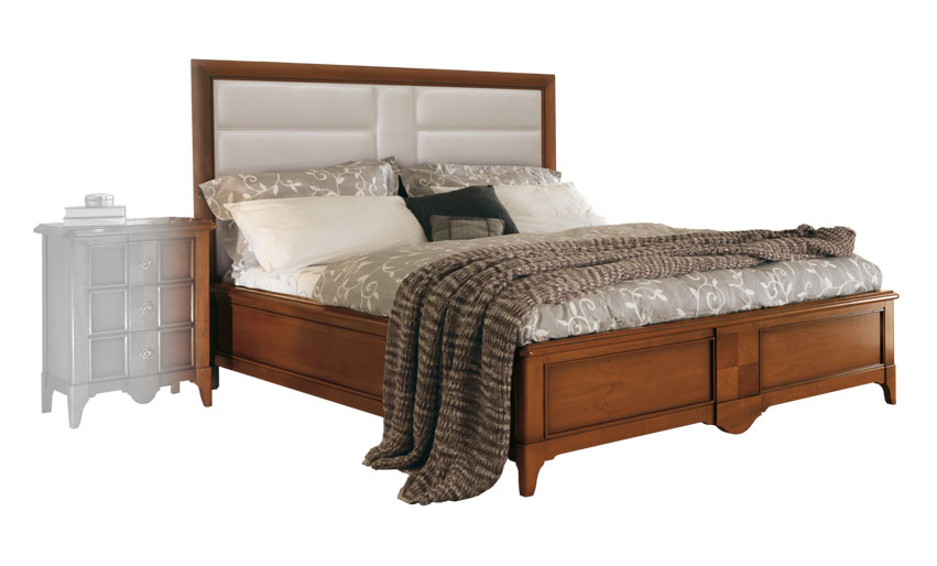 Schöne und lineare Struktur für ein elegantes Doppelbett aus Massivholz von Lindenbaum. Die Intarsie im Zentrum des Fußteils ist sehr schön.