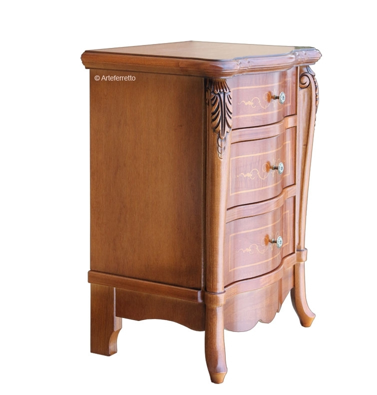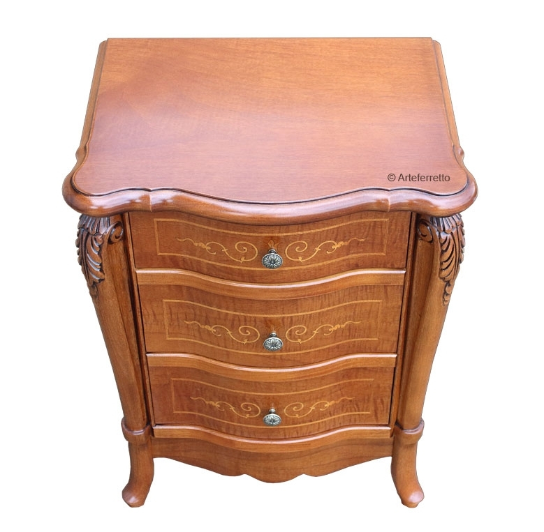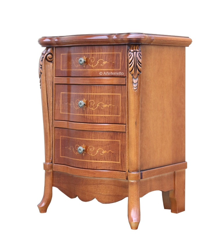 Schöner Nachttisch Alisei für ein schönes und klassischen Schlafzimmer. Das Möbel hat 3 geräumigen Schubladen mit Intarsie. Die Struktur ist stark und wird durch eine elegante Schnitzarbeit und eine schöne Intarsie verschönert. Bei der Lieferung ist der Nachttisch Alisei schon montiert.