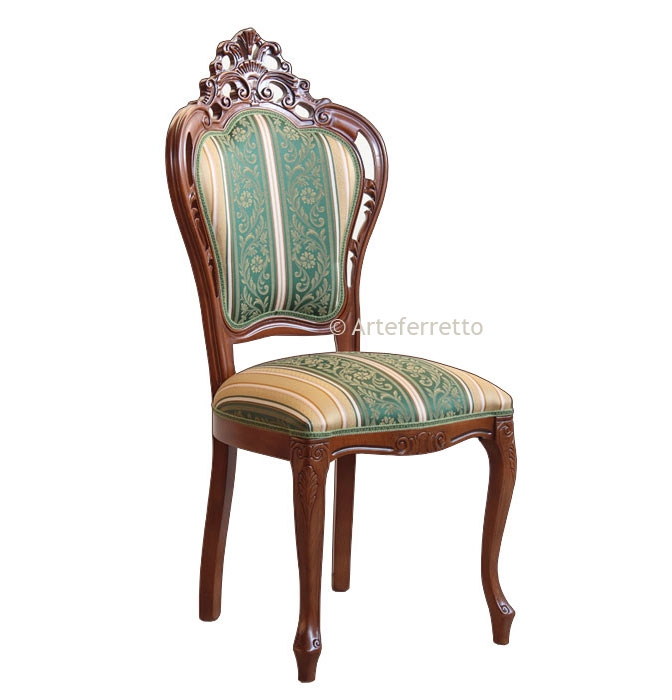 Der Stuhl hat gleichzeitig ein starkes und elegantes Gestell. Die Rückenlehne, die Armlehnen und der Sitz sind aus Stoff verkleidet. Die Besonderheiten dieses Stuhls sind die elegante und klassische Linie mit der Schnitzarbeit und den Bezug, die die hohe Qualität und den Preis zusammengestellt.