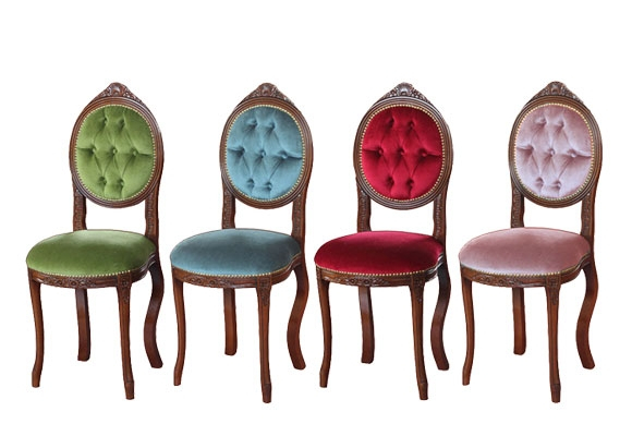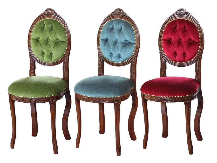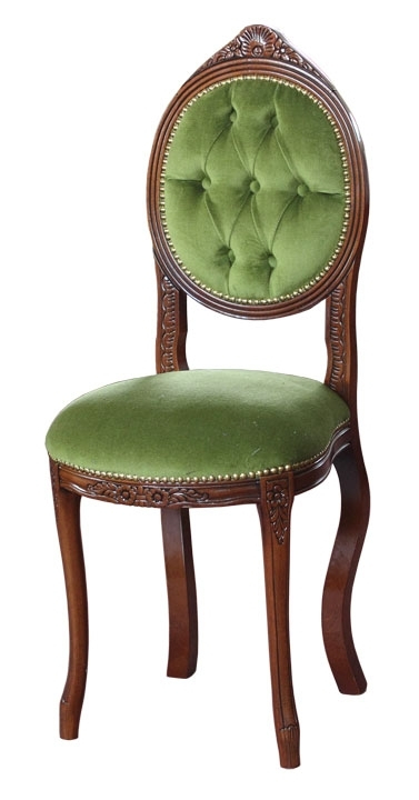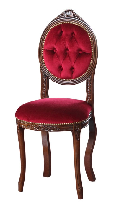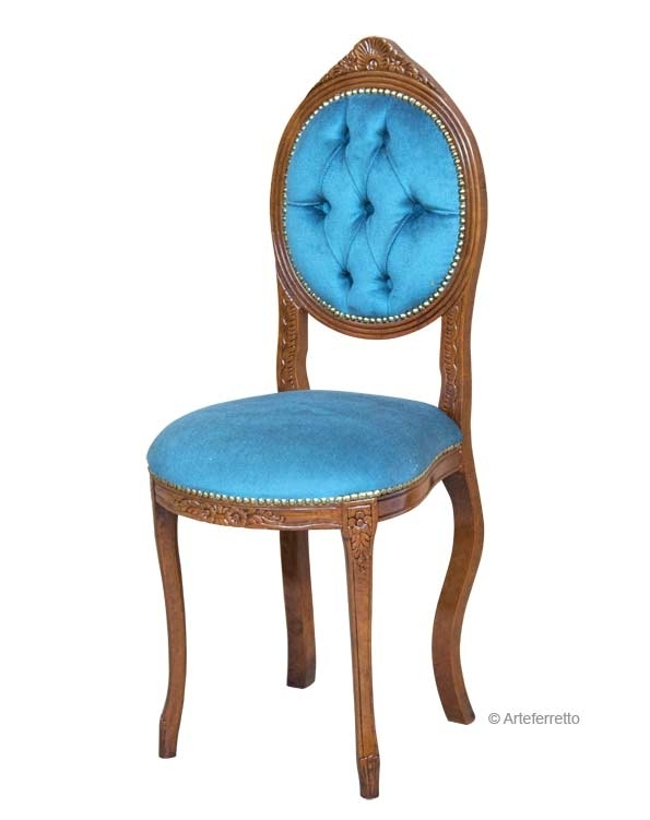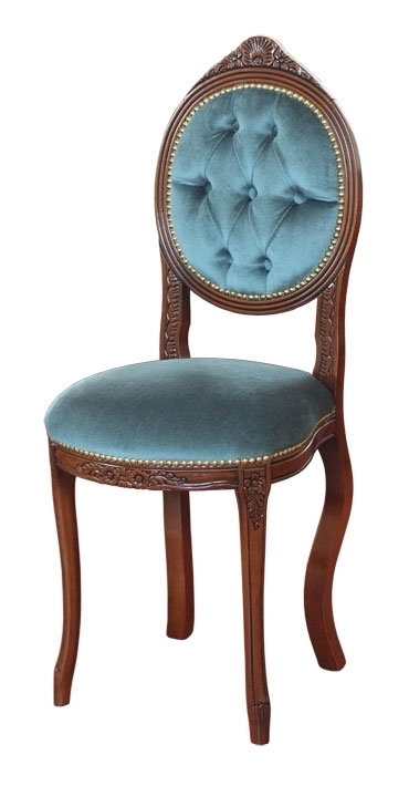Der Stuhl hat gleichzeitig ein starkes und elegantes Gestell. Die Rückenlehne, die Armlehnen und der Sitz sind aus Stoff verkleidet. Die Besonderheiten dieses Stuhls sind die elegante und klassische Linie mit der Schnitzarbeit und den Bezug, die die hohe Qualität und den Preis zusammengestellt.