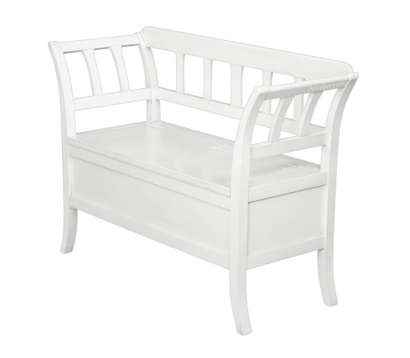 Schöner Sitzbank mit Klappe weiß auf dem Bild, verfügbar aber in vielen anderen Farben. Das Möbel ist zusammen Sitzbank und Truhe. Sehr schön mit einem Kissen.