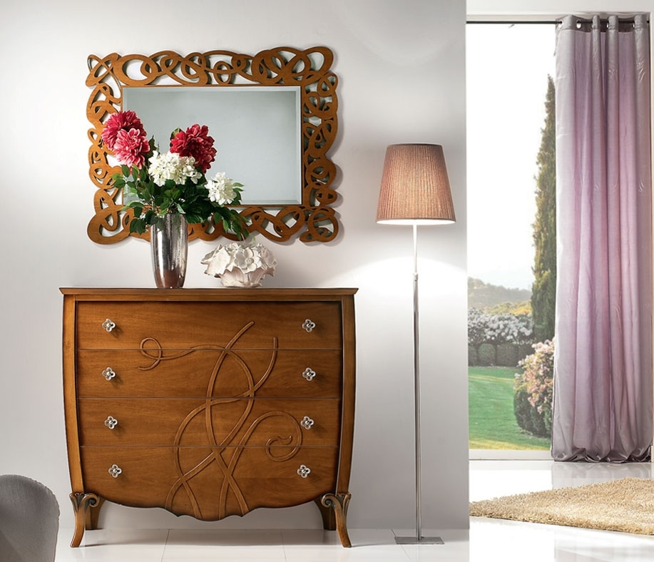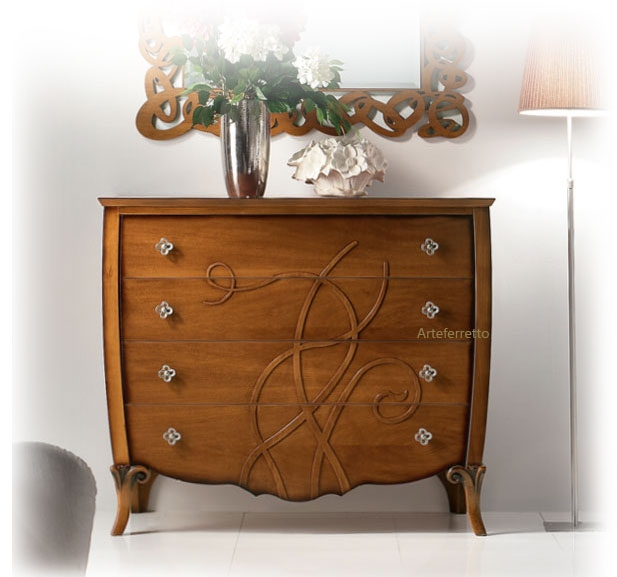 Das Möbel 4 geräumigen Schubladen. Die Besonderheit ist genau die Reliefverzierung. Die kurve Linie der Seiten trifft die Schnitzarbeit der Füße. Die Kommode isch ist aus Massivholz: Buchenholz für die Fuße und Toulipier für Schubladen und Struktur.