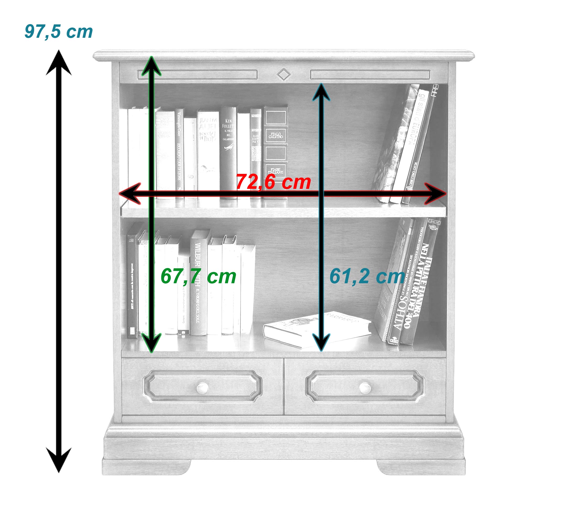 Das Möbel hat zwei geräumige Fächer mit einem regulierbaren Einlegeboden (5 Ständer). Der Einlegeboden ist sehr stark, um große Gewichte ohne Faltung zu vertragen. Dieses Möbel hat also eine elegante klassische Linie und edle Details, die mit der Zweckmäßigkeit zusammengestellt werden.