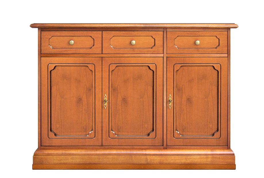 Die Besonderheiten dieses Möbels sind die elegante Linie und die Zweckmäßigkeit zusammen. Die Anrichte 3 Schranktüren ist sehr schön mit klassischen und eleganten Stil, ist sehr funktionell und praktisch. Die 2 Schubkästen (1 doppelt) sind sehr geräumig. Die 3 Schranktüren haben Einlegeböden, sehr stark und praktisch darin.