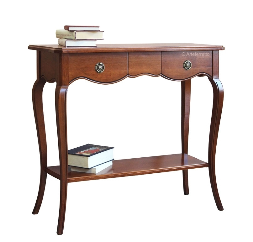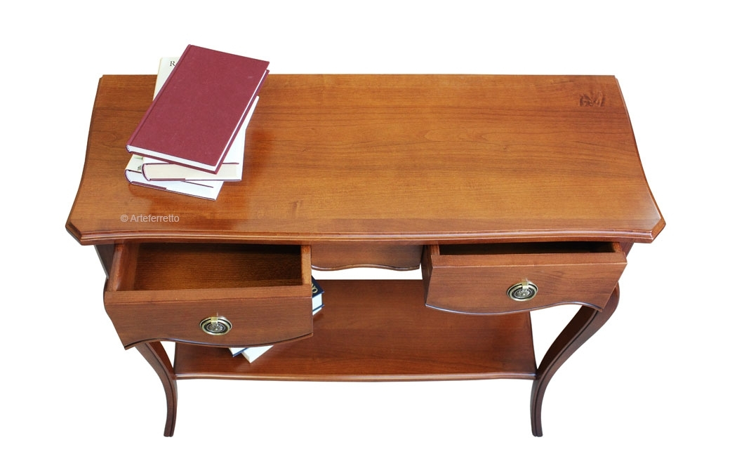 Schwarzer Konsolentisch 2 Schubladen, sehr schön mit einer profilierten Linie.Die Struktur ist schlicht und elegant, perfekt für jede Wohneinrichtung, z.B. mit einem Spiegel, einem Bild, usw.Das Möbel hat 2 Schubladen. Der Farbton ist auf dem Bild Schwarz antik: die Basis ist aus Kirschholz, dann wird die Schwarzlackierung gemacht und danach ist die Schleifung des Farbtons der Möbelkanten. Das Möbel ist also Schwarz und auch Kirschholz in den Kanten und im Inneren.Schwarzer Konsolentisch 2 Schubladen ideal für Wohnzimmer, Flur, Wartehalle, usw.Bei der Lieferung ist es schon montiert.Maße:Breite 96 cm;Höhe 80,5 cm;Tiefe 41 cm.