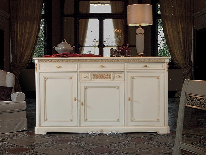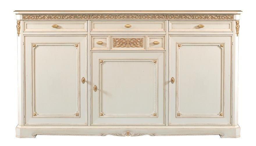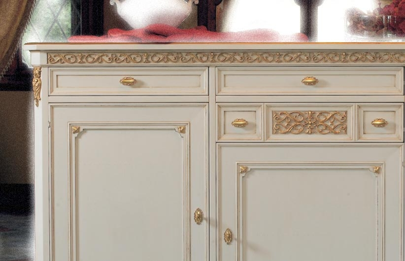 Schöne und elegante Anrichte mit Blattgold für eine elegante Wohnung.Die Lackierung ist durch Details in Blattgold verschönt, die den Schnitzarbeit gut darstellen.Eine große Besonderheit des Möbels ist Ihr Fassungsvermögen.Große Fächer stehen mit einem beweglichen Einlegeboden in den Türen. Die Anrichte hat einen zentralen Schublade.Klassisches Design und Stil für ein Möbel, das nie den Einfluss der Mode befolgt.Bei der Lieferung ist das Möbel schon montiert. Anrichte mit Blattgold ideal für Wohnzimmer.Maße:- Gesamt: B177 x T57,8 x H91,3 cm- Innenschubkasten cm B47 x T42 x H11,4 (Außen-Breite cm 49,7)- Seitliche Türen cm B49,3 x H60,2- Zentrale Tür cm B49,7 x H44,5