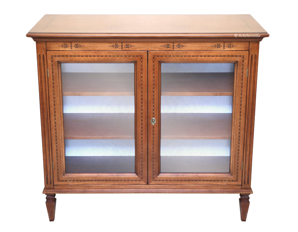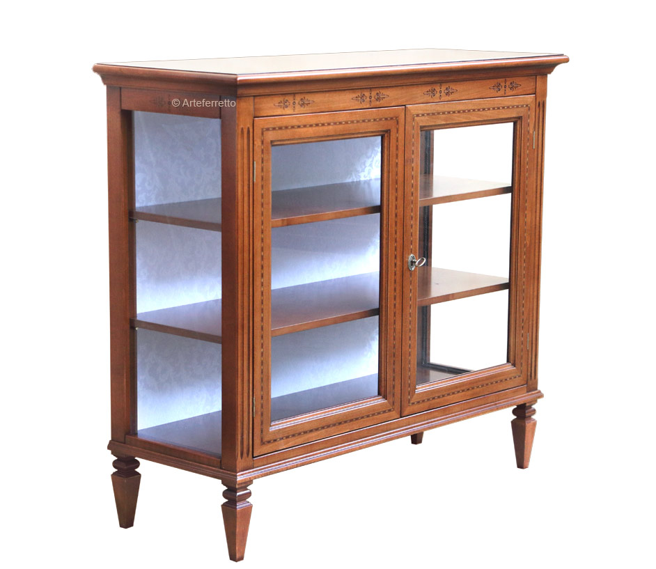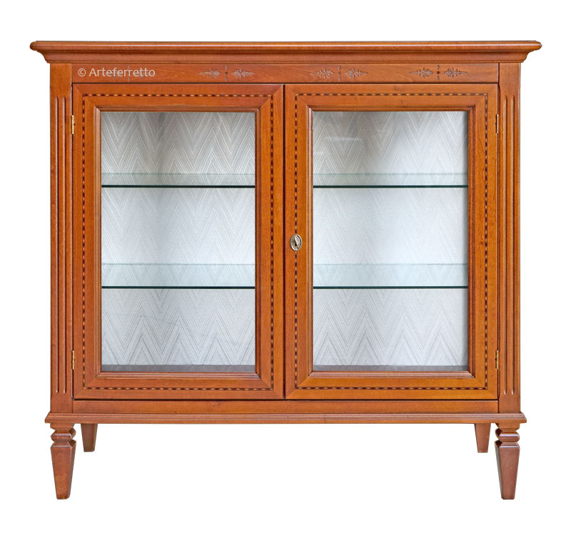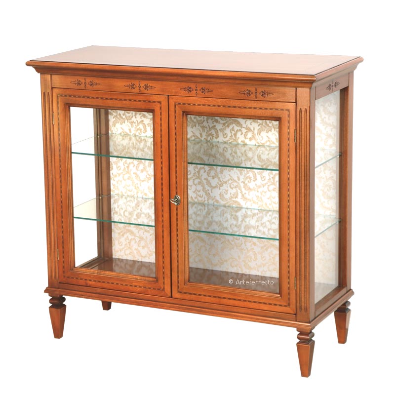 Die Rücklehne der Vitrine mit Intarsie niedrig hat einen schönen Stoff.
