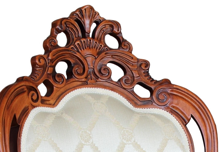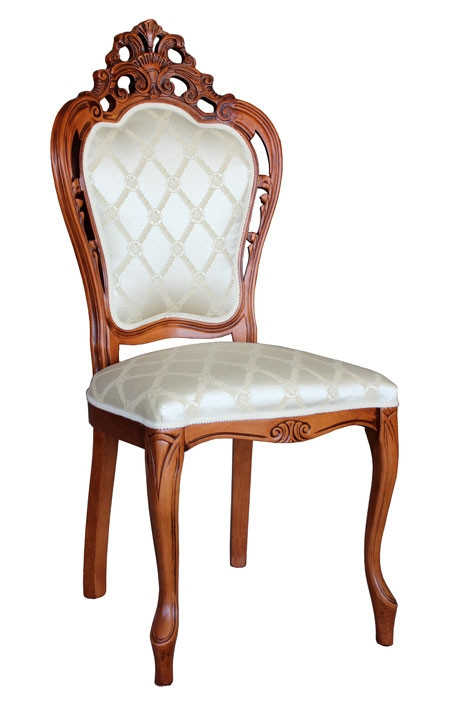 Der Stuhl hat gleichzeitig ein starkes und elegantes Gestell. Die Rückenlehne, die Armlehnen und der Sitz sind aus Stoff verkleidet. Die Besonderheiten dieses Stuhls sind die elegante und klassische Linie mit der Schnitzarbeit und den Bezug, die die hohe Qualität und den Preis zusammengestellt.