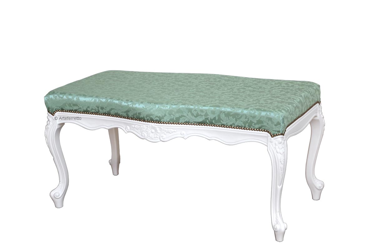 Sitzbank aus Holz im eleganten und italienischen Stil verarbeitet von Handwerkern, die die Holzstruktur lackiert, gepolstert und tapeziert haben.