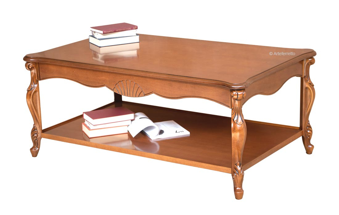 Rechteckiger Couchtisch, der eine schöne Berarbeitung in der Beinen hat.