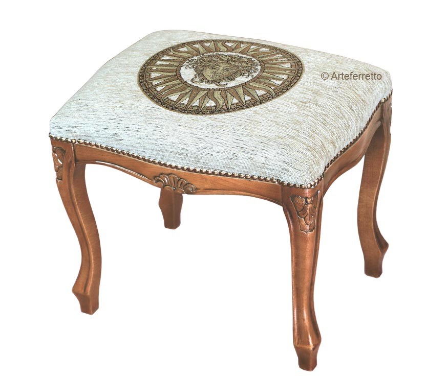 Ein kleines Möbelstück aber mit großer Klasse und Eleganz, mit der unverkennbaren Meduse Figur mit golden Sonnenstrahl in der Rücklehne und im Sitz. Kleiner hocker ideal für Schlafzimmer oder Wohnzimmer, bei der Lieferung schon montiert.