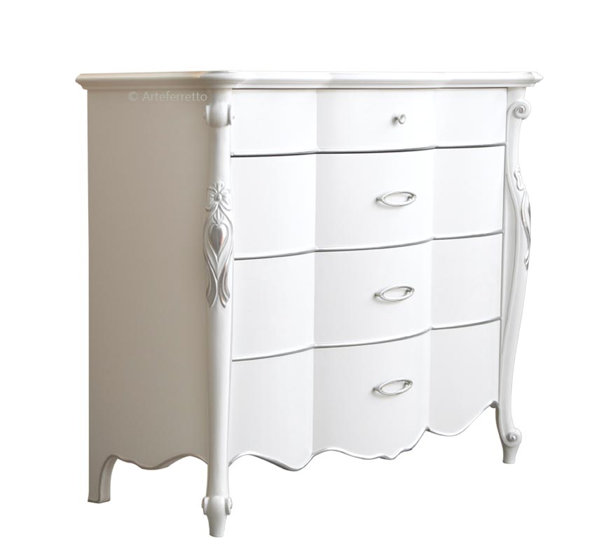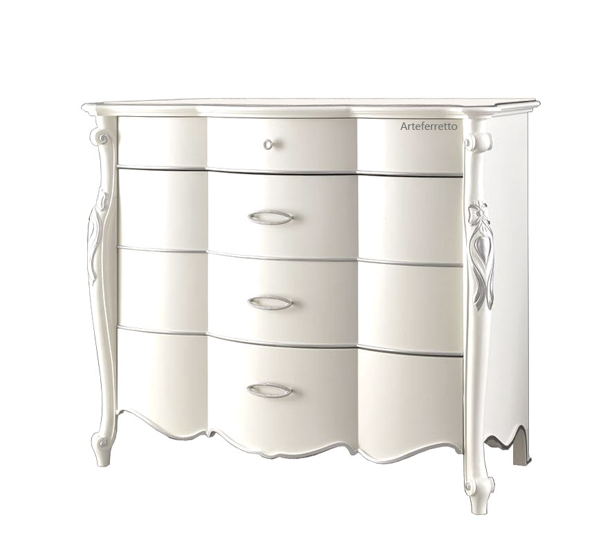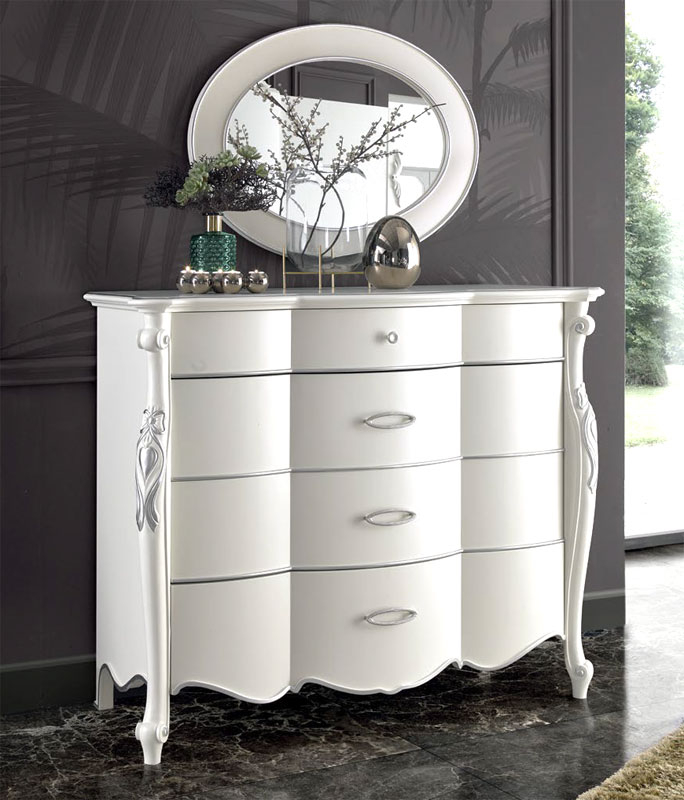 Klassische Kommode 1 Klappe elegant und fein.Die Besonderheit dieser Kommode aus Holz sind die Details verarbeitet mit Sorgfalt von spezialisierten Handwerkern, die auch das Möbel Kommode lackiert haben.Die Blumen Verzierung hat Gold- und Silberblatt, das das Bild hervorhebt.Klassische Kommode 1 Klappe und 3 breite Schubladen, aber hinter der Klappe gibt es andere kleine Schubladen.Die Struktur aus Holz von dieser Kommode Stilmöbel ist geschnitzt und die Füßen sind sehr besonder.Möbelstück elegant geschnitzt und gemalt ist wirklich eine Werke von unserer Handarbeit.Kommode Stil italienisch für Ihre Schlafzimmereinrichtung.Maße: Breite: cm 145Tiefe: cm 58Höhe: cm 127