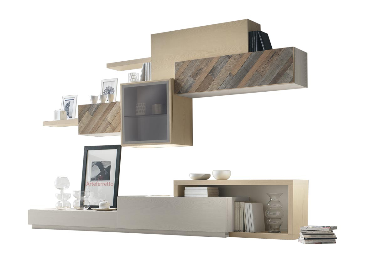 Die Struktur der Module besteht aus Tischlerplatten, die mit natürlich gebürstetem Eschenholz beschichtet sind (ein Finish, das die natürliche Maserung des Holzes hervorhebt).Die Innenseiten sind aus Tischlerplatten, die mit natürlichem Tanganjika-Nussbaum beschichtet sind.