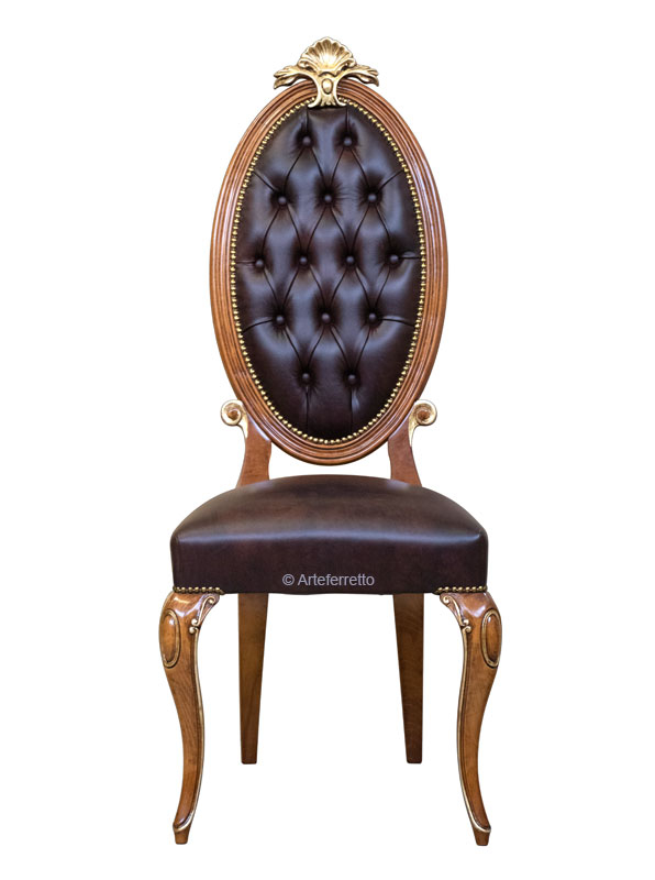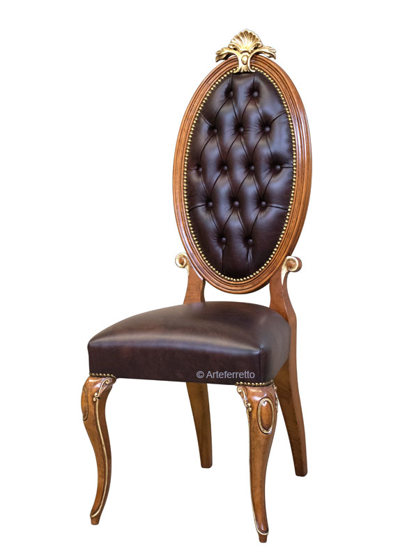 Der Stuhl hat gleichzeitig ein starkes und elegantes Gestell. Die Rückenlehne, die Armlehnen und der Sitz sind aus Stoff verkleidet. Die Besonderheiten dieses Stuhls sind die elegante und klassische Linie mit der Schnitzarbeit und den Bezug, die die hohe Qualität und den Preis zusammengestellt.