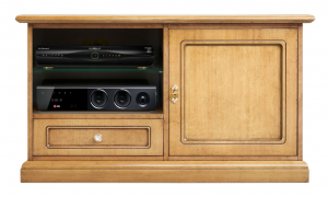 Ein Türfach, eine Schublade und ein höhenverstellbares Fach machen dieses handgemachte Tv-Möbel sehr funktional. Das Türfach enthält einen höhenverstellbaren Einlegeboden.