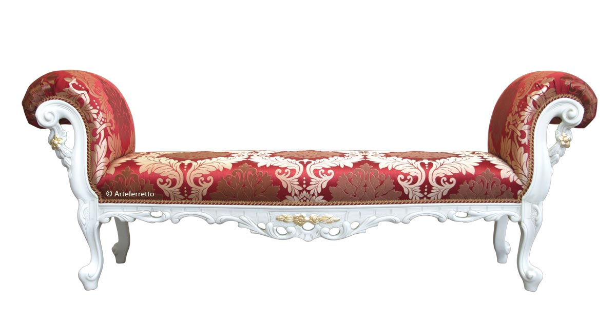 Sitzbank aus Holz im eleganten und italienischen Stil verarbeitet von Handwerkern, die die Holzstruktur lackiert, gepolstert und tapeziert haben.