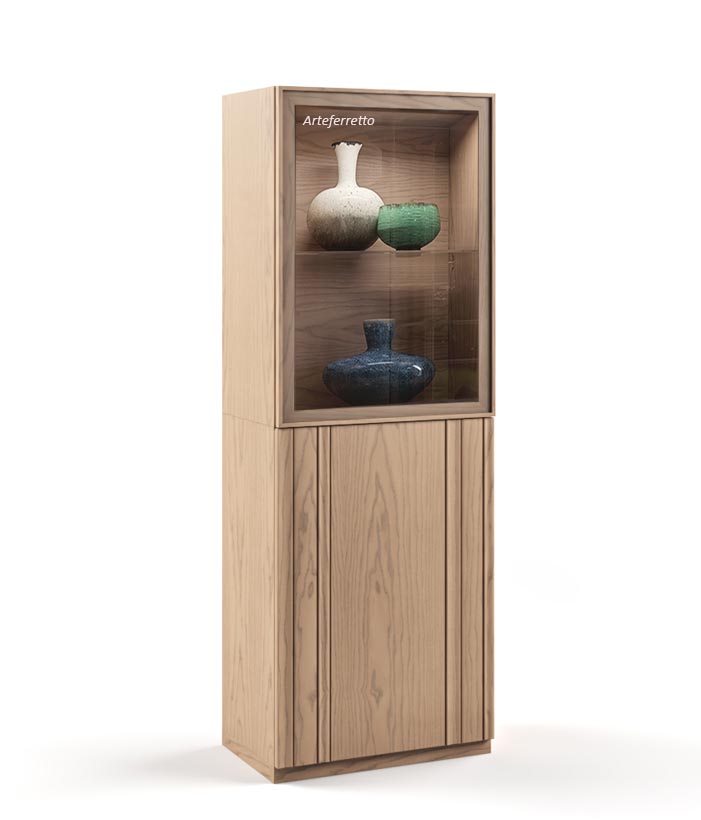 Der obere Teil ist durch einen zentralen Einlegeboden in zwei Fächer unterteilt und durch einer schönen Glastür verschlossen.