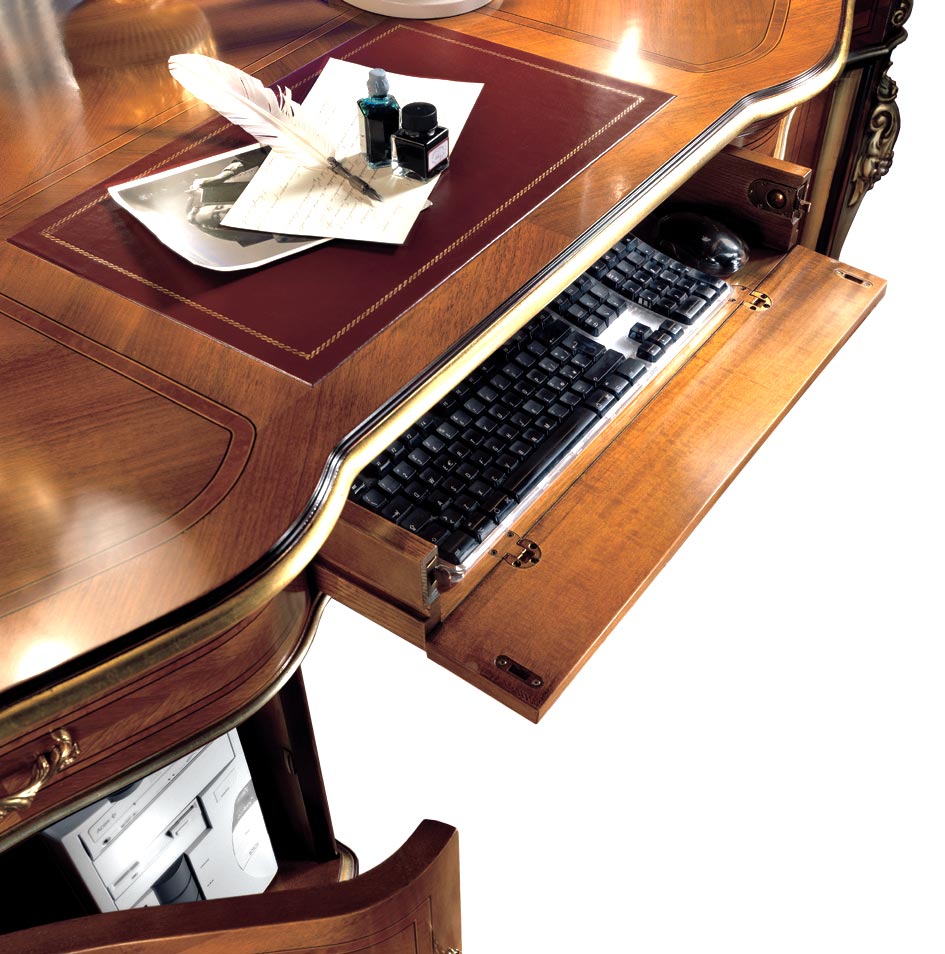 Außer den 5 Schubladen, von denen eine mit Schlüssel ausgestattet wird, gibt es auch 2 seitliche Schubladen, die die benutzbare Tischplatte erhöhen.